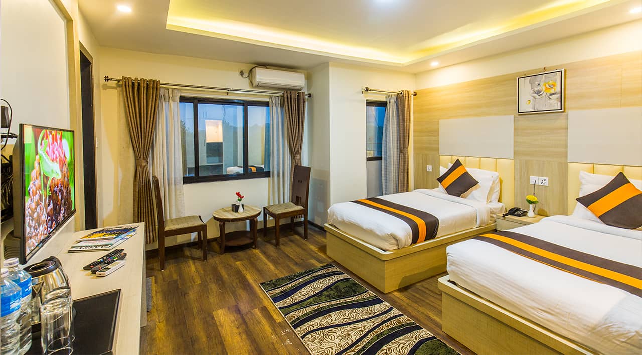 This hotel is located just opposite to the main bus terminus of Kathmandu. Pashupatinath temple is just ten minutes’ walk from this hotel. Rooms are good well maintained and clean. Attached toilet is also good fitted with geyser. Two automatic lifts with good capacities are available. Stairs are wide. There are no closed corridors because the hotel has an atrium which means one could see the roof sealing from ground floor and rooms are located surrounding the open corridor. Lifts are running inside transparent tube. It has a bar also. Food is good and always prepared against order.